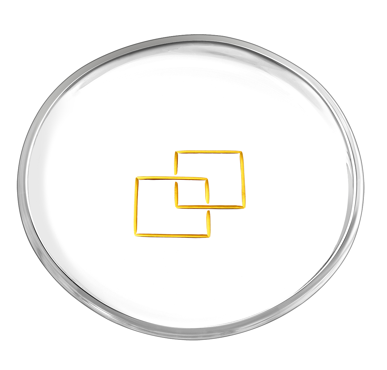 Δίσκος γυάλινος με χάραξη αμμοβολής σε χρυσό χρώμα και σχέδιο δύο ενωμένα τετράγωνα.