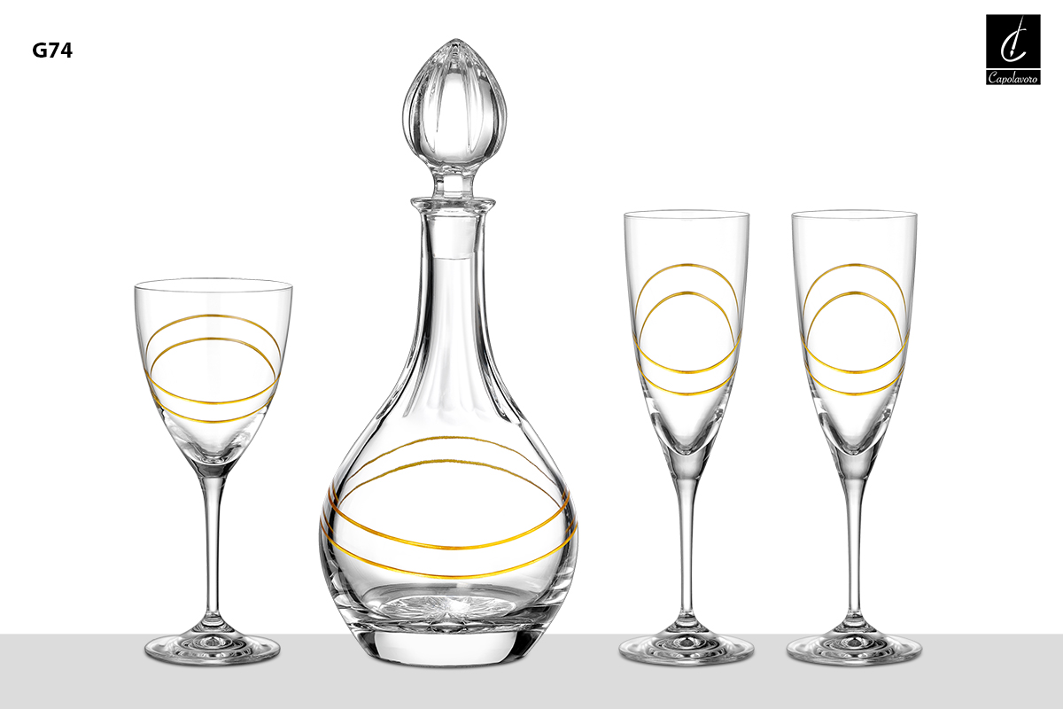 Το σετ περιλαμβάνει κρυστάλλινη καράφα 1000ml,ένα κρυστάλλινο ποτήρι κρασιού 250ml και δύο κρυστάλλινα ποτήρια σαμπάνιας 220ml.