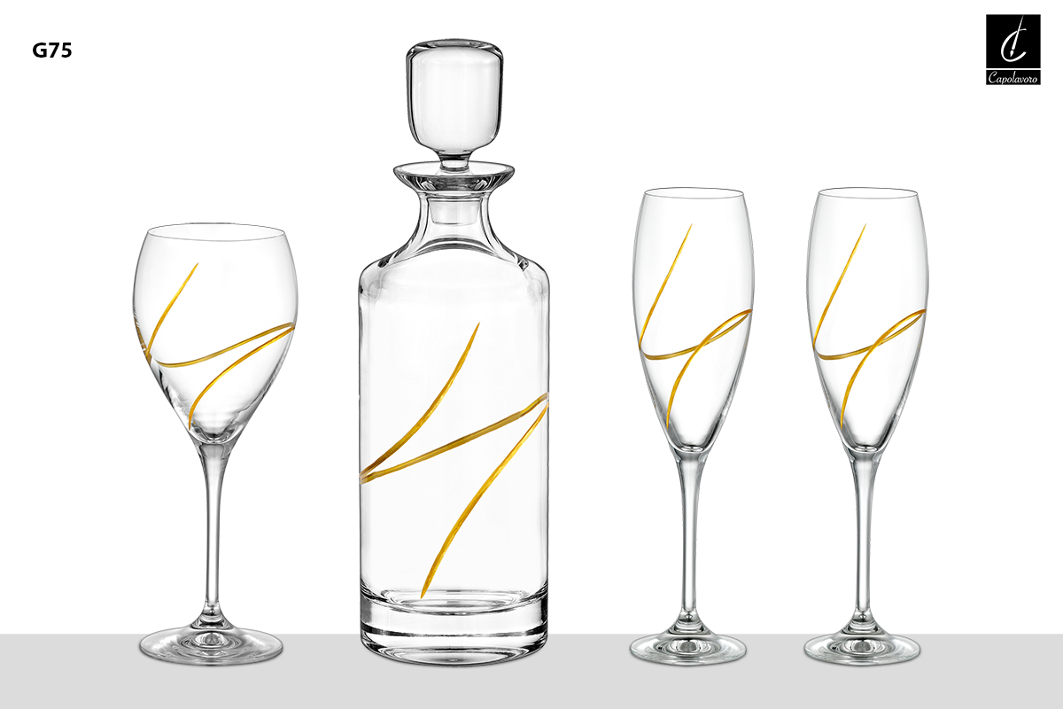 Το σετ περιλαμβάνει κρυστάλλινη καράφα 750ml,ένα κρυστάλλινο ποτήρι κρασιού 340ml και δύο κρυστάλλινα ποτήρια σαμπάνιας 210ml .