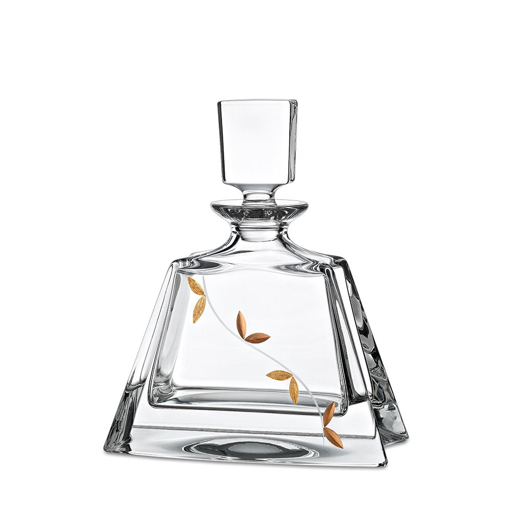 Κρυστάλλινη καράφα Bοημίας, με χάραξη φύλλα σε χρυσό και χάλκινο χρώμα.
