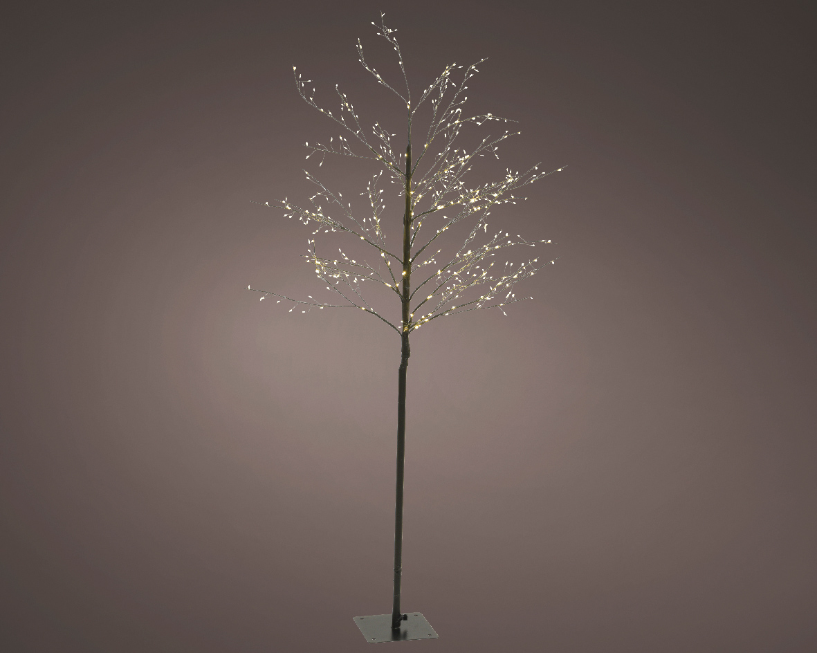Μεταλλικό δέντρο με φωτάκια LED σε ζεστή λευκή απόχρωση ημέρας και μαύρο κορμό για εξωτερική διακόσμηση.
