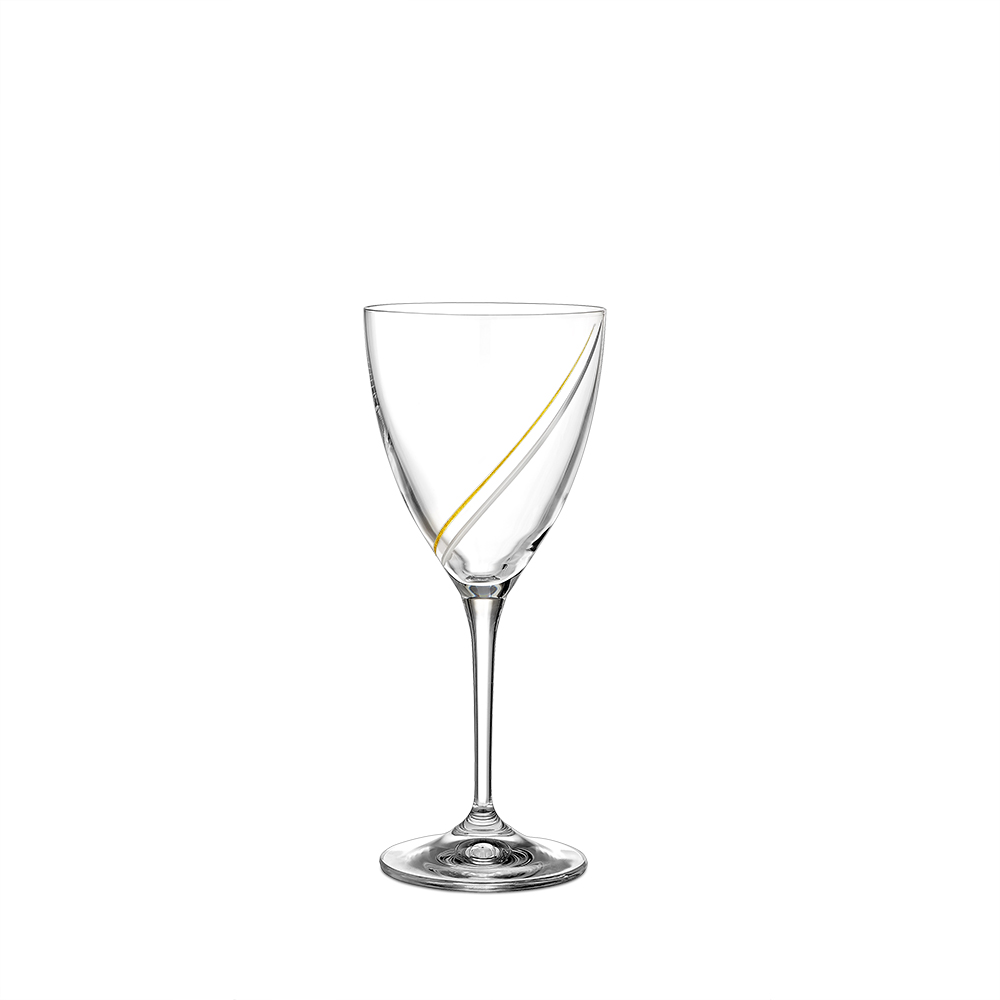 Κρυστάλλινο ποτήρι κρασιού χαραγμένο με διαμάντι σε χρυσό χρώμα με σχέδιο χρυσή και ασημένια γραμμή .