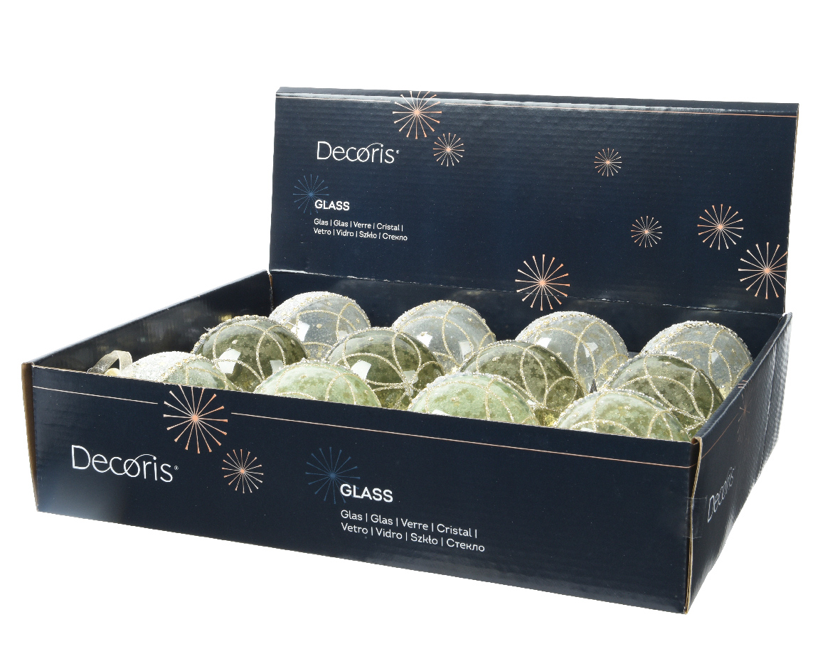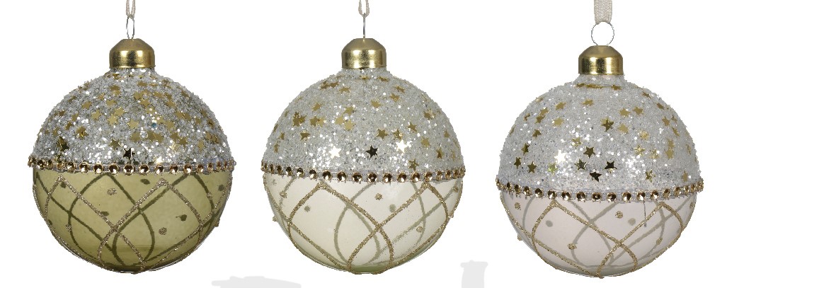 Σετ 12 τμχ χριστουγεννιάτικη ημιδιαφανής γυάλινη μπάλα σε τρία χρώματα λευκό, εκρού και σαμπανί.