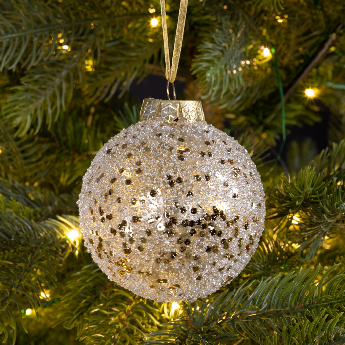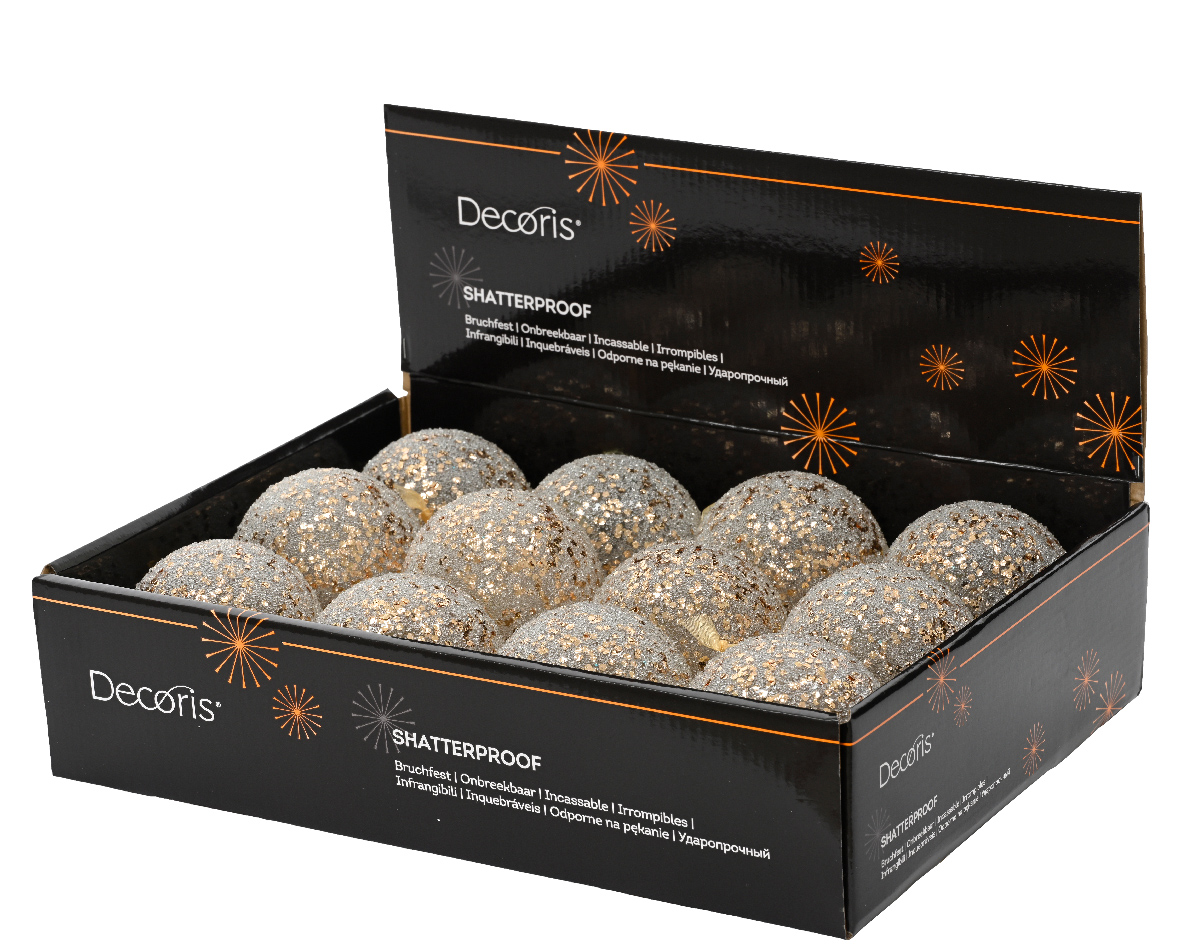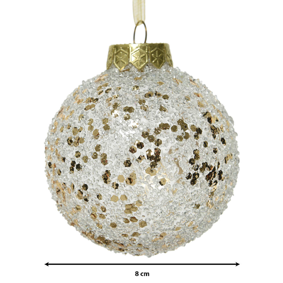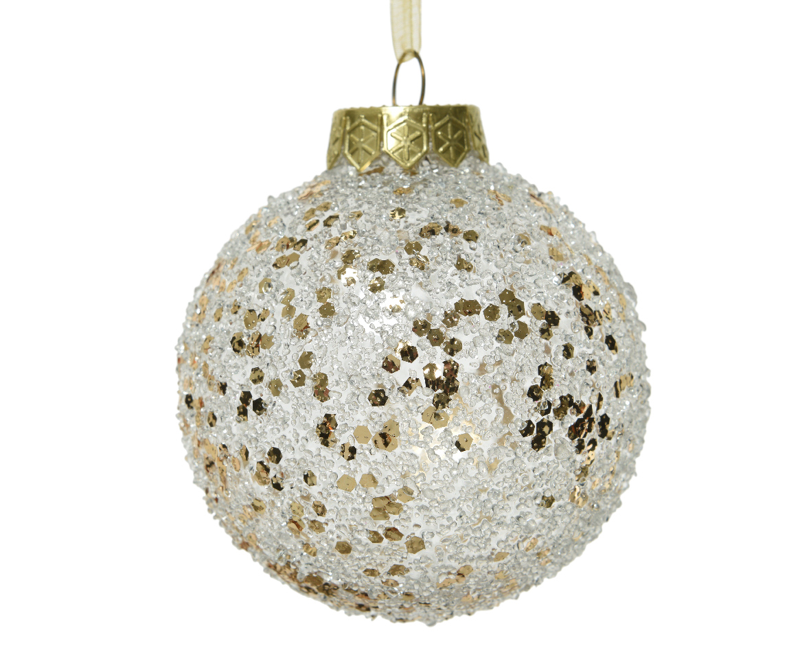 Σετ 12 τμχ χριστουγεννιάτικη άθραυστη σαμπανί μπάλα με χρυσές πούλιες και διάφανες χάντρες