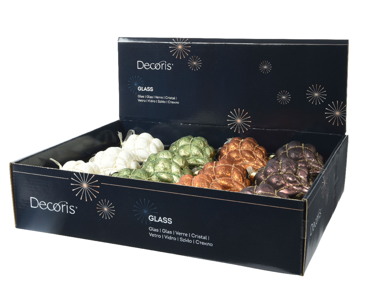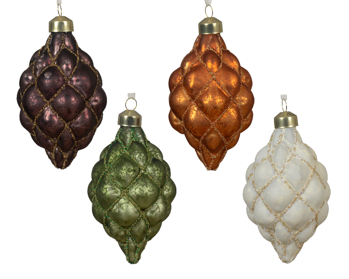Σετ 12 τμχ πολύ ιδιαίτερων χριστουγεννιάτικων γυάλινων κωνικών στολιδιών με σχηματισμούς ρόμβου σε 4 χρώματα.