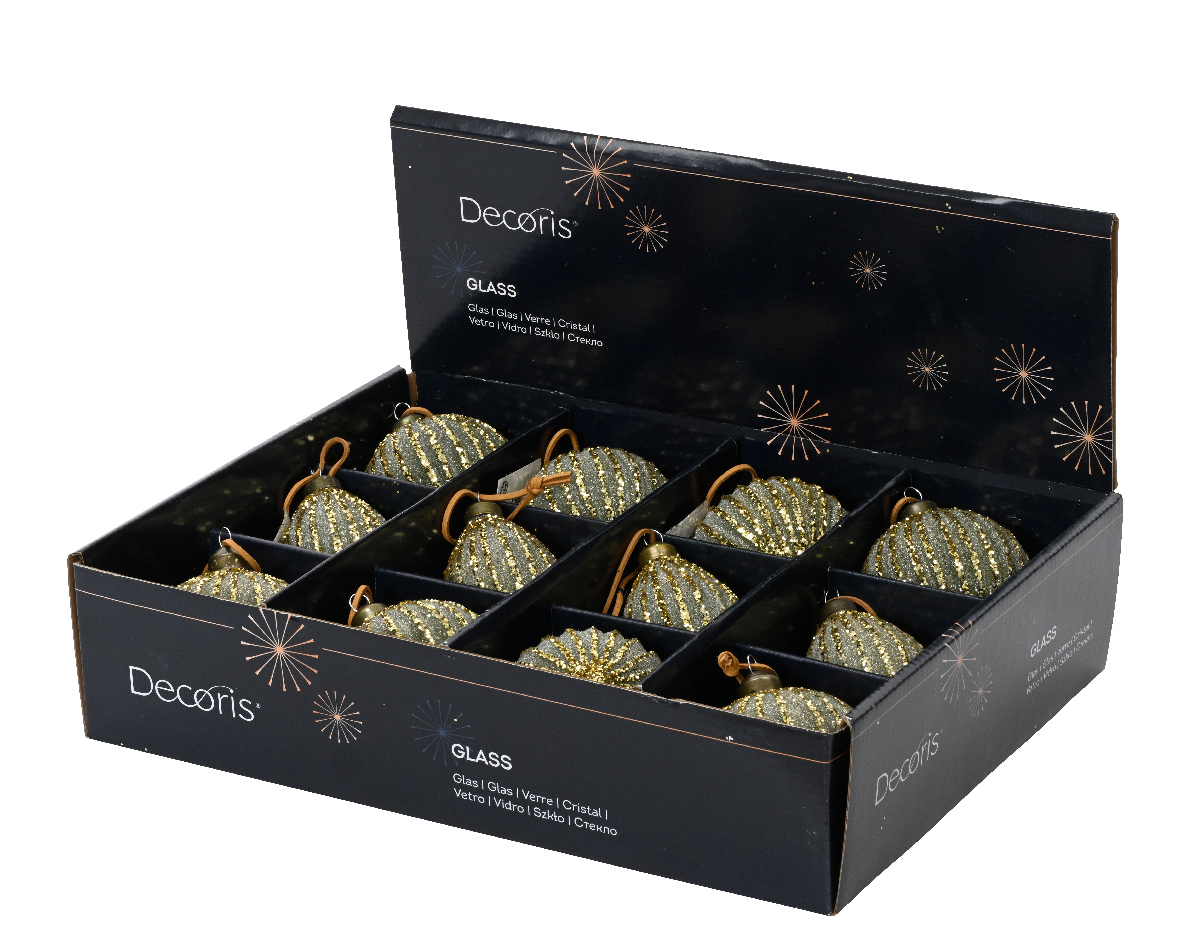 • 4 στολίδια σε σχήμα μπάλας με κάθετες γραμμές από χρυσές πούλιες