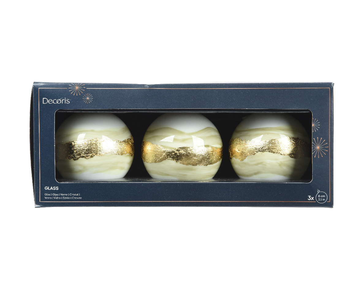 Σετ 3 τμχ χριστουγεννιάτικη γυάλινη μπάλα με λευκή βάση κι χρυσές/σαμπανί λεπτομέριες μοιάζει σαν να είναι μάρμαρο Διάμετρος 8εκ