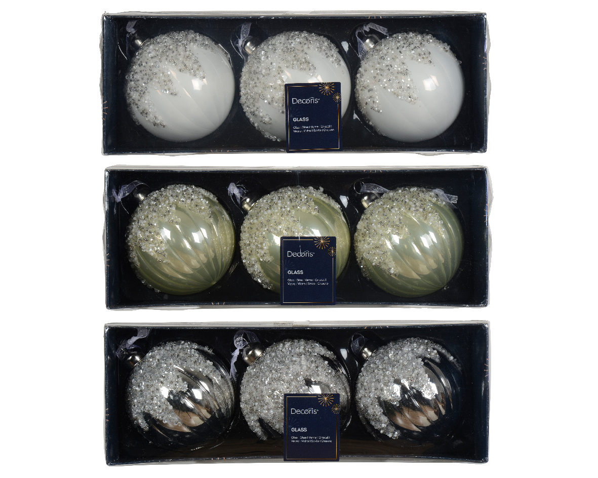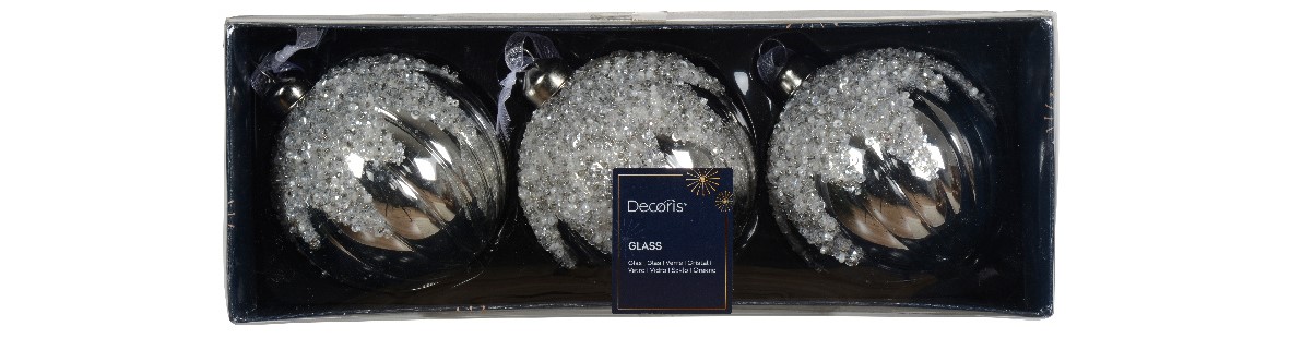 Μια συσκευασία με 3 ίδιες χριστουγεννιάτικες μπάλες σε ασημί απόχρωση με λευκές και ασημί χάντρες και πούλιες σε σχήμα σταλακτίτη.