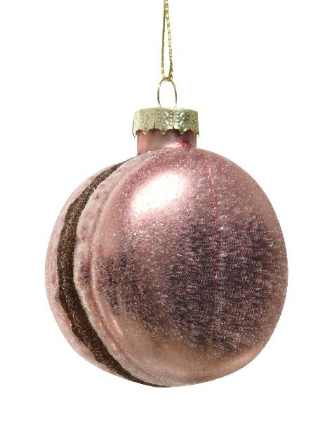 Χριστουγεννιάτικο στολίδι, χρώματος ροζ, σε σχήμα μακαρόν με καφέ γέμιση. Κρέμεται με χρυσή κλωστή. Η επιφάνεια έχει αραιή στρώση γκλίτερ.