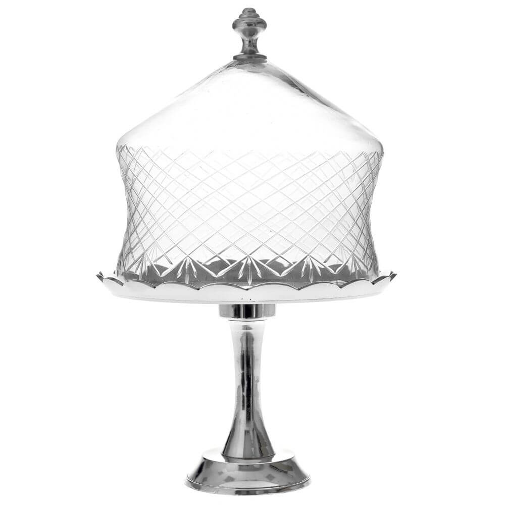 Τουρτιέρα μεταλλική ασημί με πόδι και καπάκι γυάλινο διάφανο ( ταγιαρισμένο ).